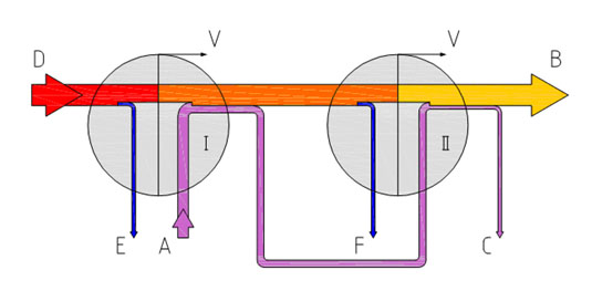 在多效蒸發裝置中,由新蒸汽加熱第一效產生的蒸汽不進入冷凝器,而是作為第二效的加熱介質得以再次利用。這樣可以將新蒸汽消耗有效降低約50%。重復利用此原理,可進一步降低新蒸汽消耗。第一效的最高加熱溫度與最后一效的最低沸點溫度形成了總溫差,分布于各個效。結果,每效溫差隨效數增加而減小。所以為達到指定的蒸發速率必須增大加熱面積。初步估算表明,用于所有效的加熱面積隨效數成比例增加,這樣一來蒸汽節省量逐漸減少的同時,投資費用顯著增加。