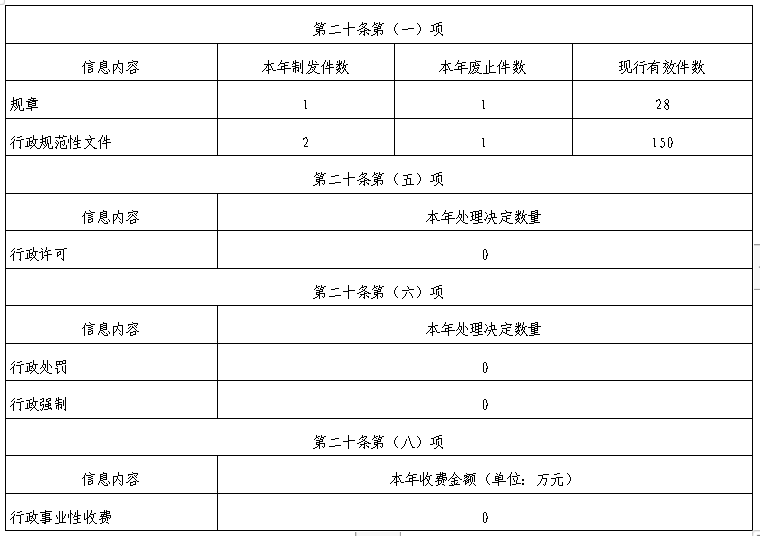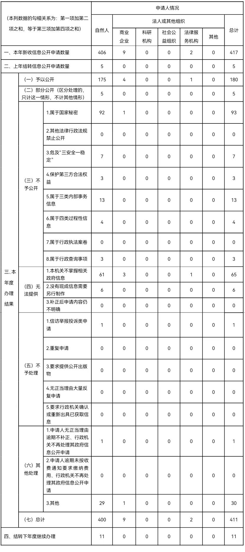 (二)依申請公開情況。全年共收到信息公開申請417件,上年度結轉辦理5件,已按規(guī)定辦結411件,結轉下年度辦理11件。已辦結的申請中,予以公開180件、部分公開5件、不予公開123件、無法提供71件、不予處理1件、其他處理31件;因信息公開被申請行政復議0件、提起行政訴訟5件。提起的行政訴訟,均為未經(jīng)復議直接起訴件,其中結果維持2件,尚未審結3件。